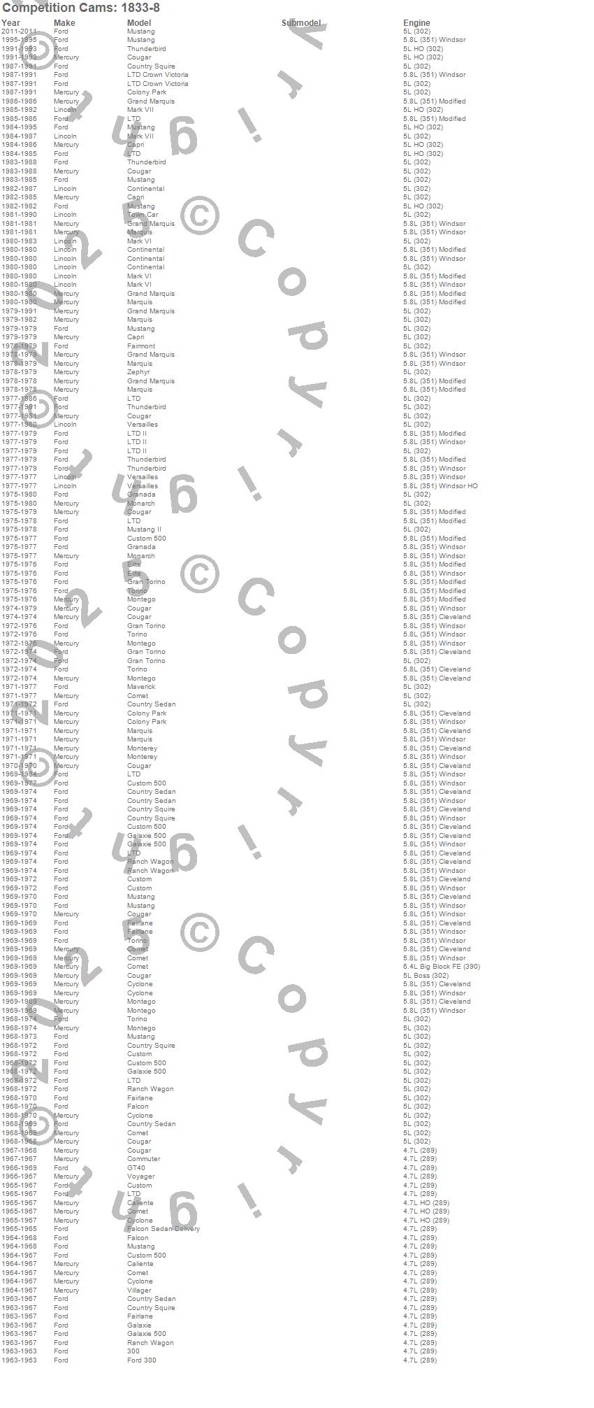 Caliente, Capri, Colony Park, Comet, Commuter, Continental, Cougar, Country Sedan, Country Squire, Custom, Custom 500, Cyclone, Elite, Fairlane, Fairmont, Falcon, Falcon Sedan Delivery, Ford 300, Galaxie, Galaxie 500