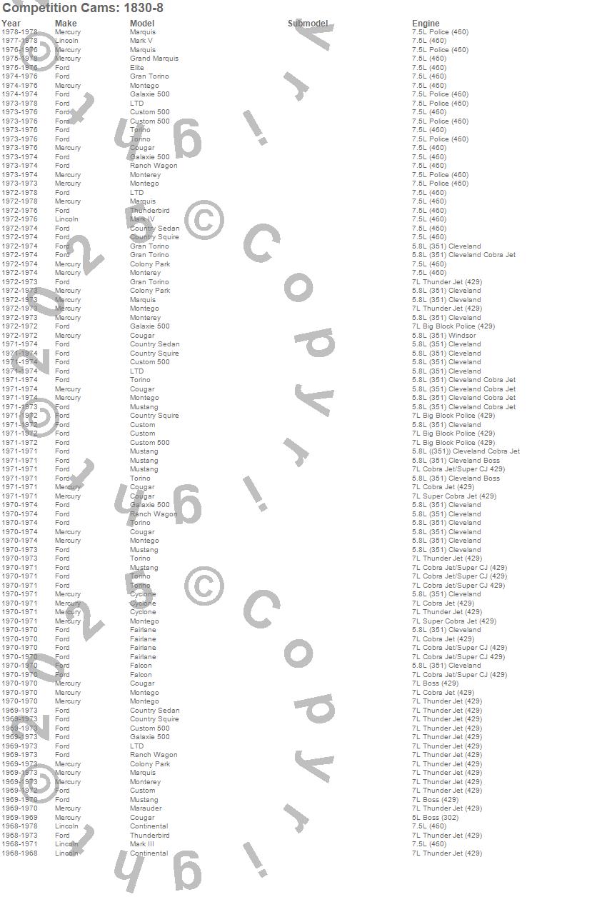 Colony Park, Continental, Cougar, Country Sedan, Country Squire, Custom, Custom 500, Cyclone, Elite, Fairlane, Falcon, Galaxie 500, Gran Torino, Grand Marquis, LTD, Marauder, Mark III, Mark IV, Mark V, Marquis