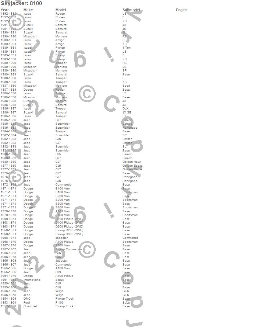 A100 Pickup, A100 Van, A108 Van, Amigo, B100 Van, B200 Van, B300 Van, CJ3, CJ5, CJ6, CJ7, Commando, D100 Pickup, D200 Pickup, D300 Pickup, F-100, Jeepster, Montero, Pickup, Raider