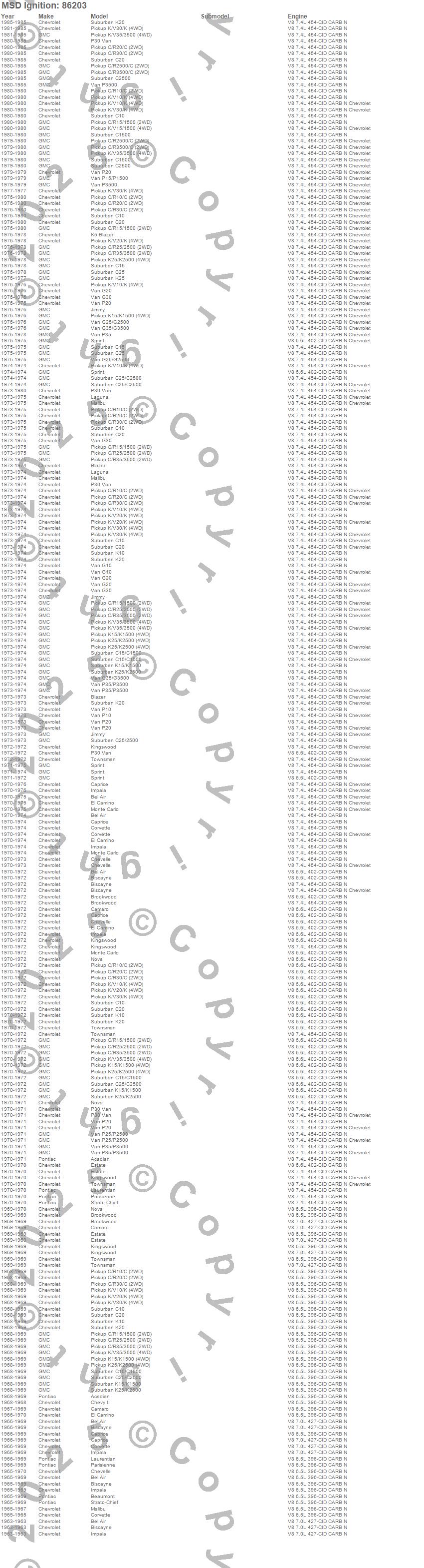 Acadian, Beaumont, Bel Air, Biscayne, Blazer, Brookwood, C10 Pickup, C10 Suburban, C15 Suburban, C15/C1500 Suburban, C1500 Pickup, C1500 Suburban, C20 Pickup, C20 Suburban, C25 Suburban, C25/C2500 Pickup, C25/C2500 Suburban, C2500 Pickup, C2500 Suburban, C30 Pickup