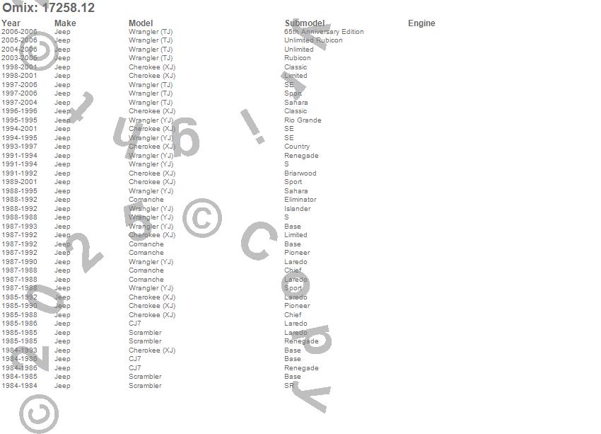 Cherokee (XJ), CJ7, Comanche, Scrambler, Wrangler (LJ), Wrangler (TJ), Wrangler (YJ), Jeep, 2006, 2005, 2004, 2003, 2002, 2001, 2000, 1999, 1998, 1997, 1996, 1995