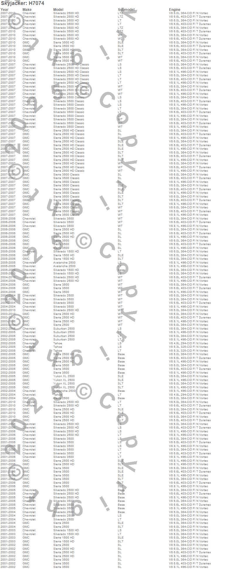 Avalanche 2500, Sierra 1500 HD, Sierra 2500, Sierra 2500 HD, Sierra 2500 HD Classic, Sierra 3500, Sierra 3500 Classic, Sierra 3500 HD, Silverado 1500 HD, Silverado 2500, Silverado 2500 HD, Silverado 2500 HD Classic, Silverado 3500, Silverado 3500 Classic, Silverado 3500 HD, Suburban 2500, Tahoe, Yukon XL 2500, Chevrolet, GMC