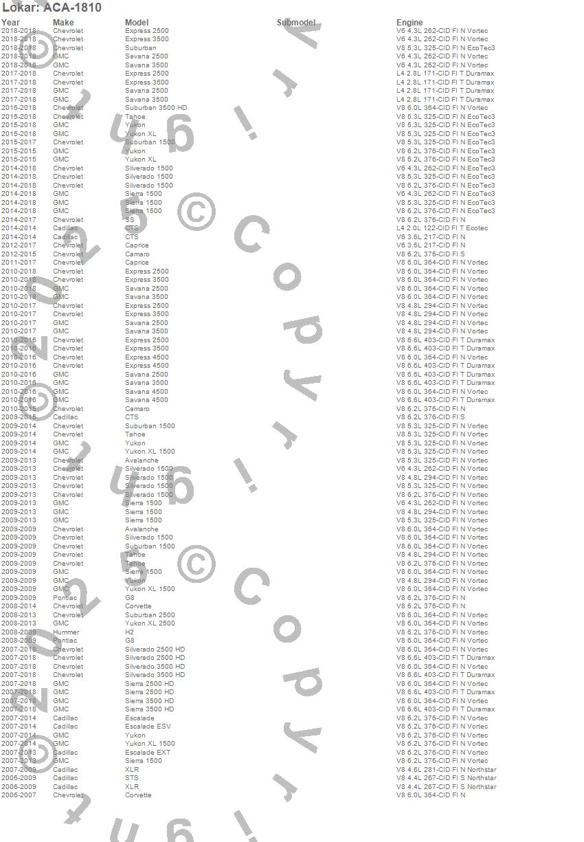 Avalanche, Camaro, Caprice, Corvette, CTS, Escalade, Escalade ESV, Escalade EXT, Express 2500, Express 3500, Express 4500, G8, H2, Savana 2500, Savana 3500, Savana 4500, Sierra 1500, Sierra 2500 HD, Sierra 3500 HD, Silverado 1500