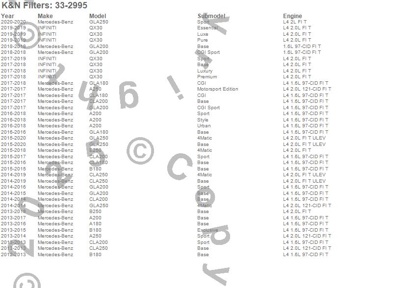 Below is an abbreviated list of applications for the Air Filter.
