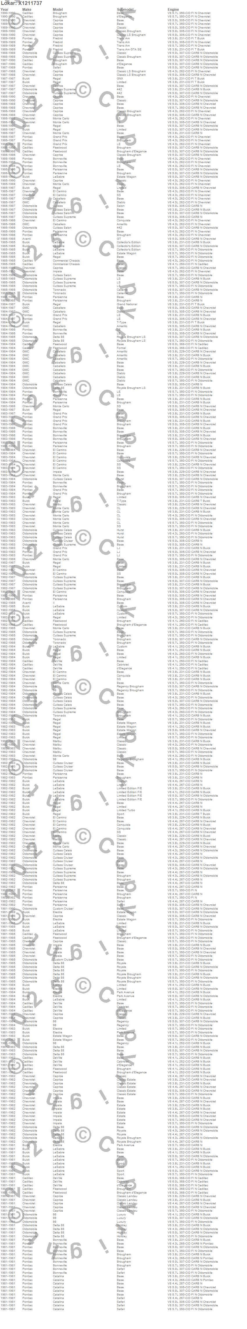 98, Bonneville, Brougham, Caballero, Caprice, Catalina, Commercial Chassis, Custom Cruiser, Cutlass, Cutlass Calais, Cutlass Cruiser, Cutlass Salon, Cutlass Supreme, Delta 88, DeVille, El Camino, Electra, Estate Wagon, Firebird, Fleetwood