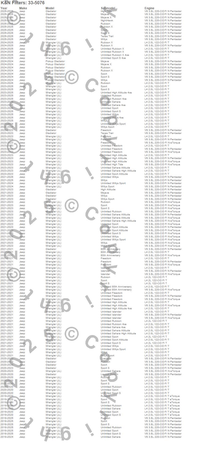 Below is an abbreviated list of applications for the Air Filter.