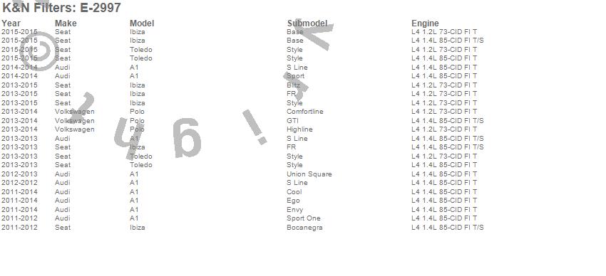 Below is an abbreviated list of applications for the Air Filter.