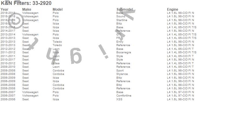 Below is an abbreviated list of applications for the Air Filter.