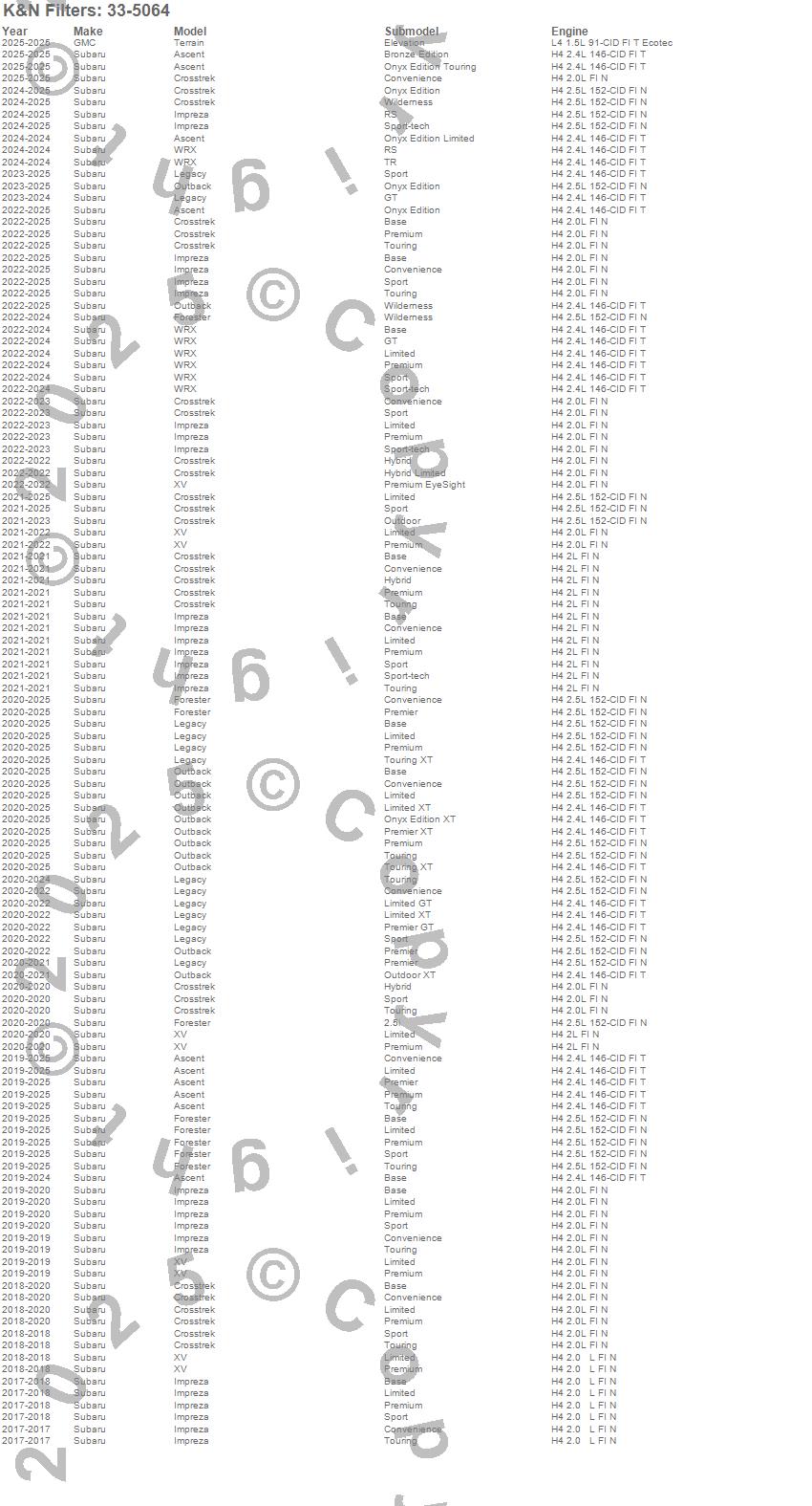 Ascent, Crosstrek, Forester, Impreza, Legacy, Outback, Terrain, WRX, XV, GMC, Subaru, 2025, 2024, 2023, 2022, 2021, 2020, 2019, 2018, 2017