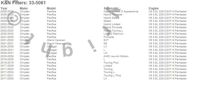 Below is an abbreviated list of applications for the Air Filter.