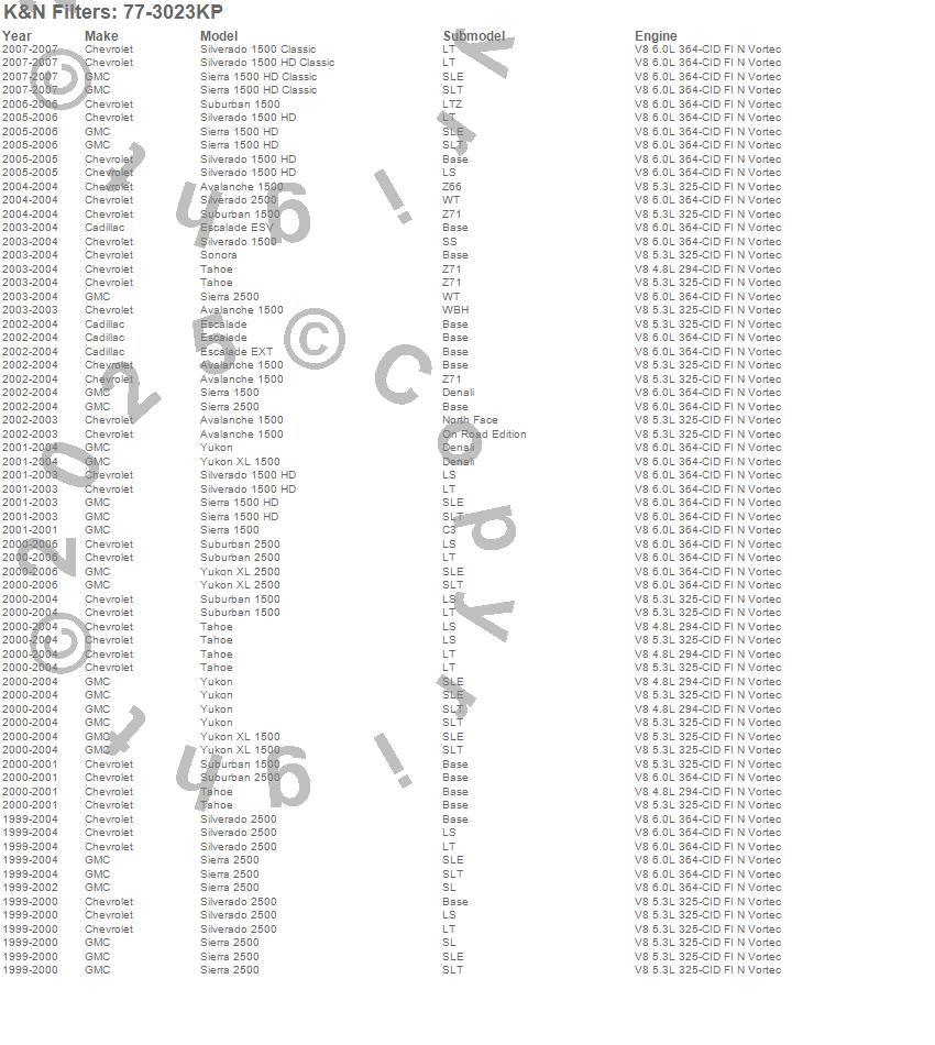 Avalanche 1500, Escalade, Escalade ESV, Escalade EXT, Sierra 1500, Sierra 1500 HD, Sierra 1500 HD Classic, Sierra 2500, Silverado 1500, Silverado 1500 Classic, Silverado 1500 HD, Silverado 1500 HD Classic, Silverado 2500, Sonora, Suburban 1500, Suburban 2500, Tahoe, Yukon, Yukon XL 1500, Yukon XL 2500