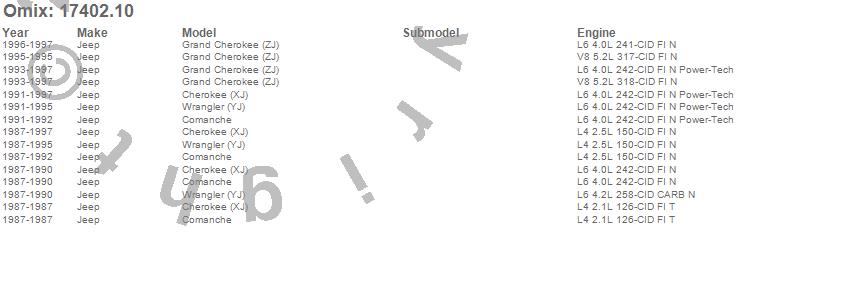 Cherokee (XJ), Comanche, Grand Cherokee (ZJ), Wrangler (YJ), Jeep, 1997, 1996, 1995, 1994, 1993, 1992, 1991, 1990, 1989, 1988, 1987