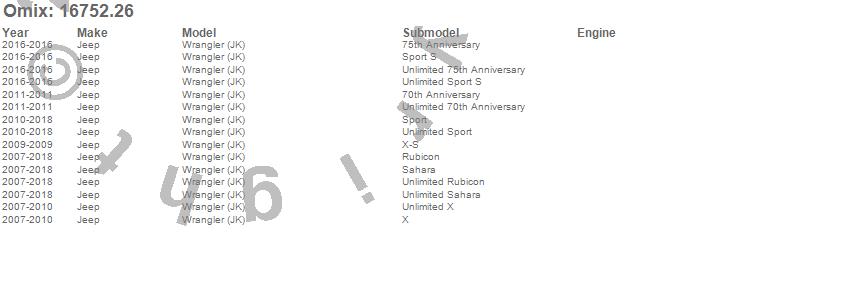Wrangler (JK), Jeep, 2018, 2017, 2016, 2015, 2014, 2013, 2012, 2011, 2010, 2009, 2008, 2007