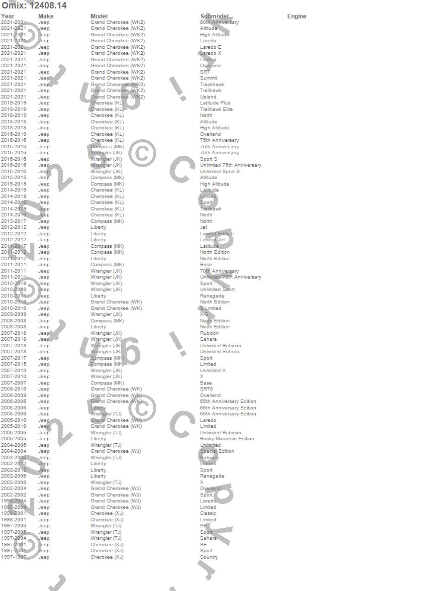 Cherokee (KL), Cherokee (XJ), Compass, Grand Cherokee (WJ), Grand Cherokee (WK), Liberty, Wrangler (JK), Wrangler (LJ), Wrangler (TJ), Jeep, 2019, 2018, 2017, 2016, 2015, 2014, 2013, 2012, 2011, 2010