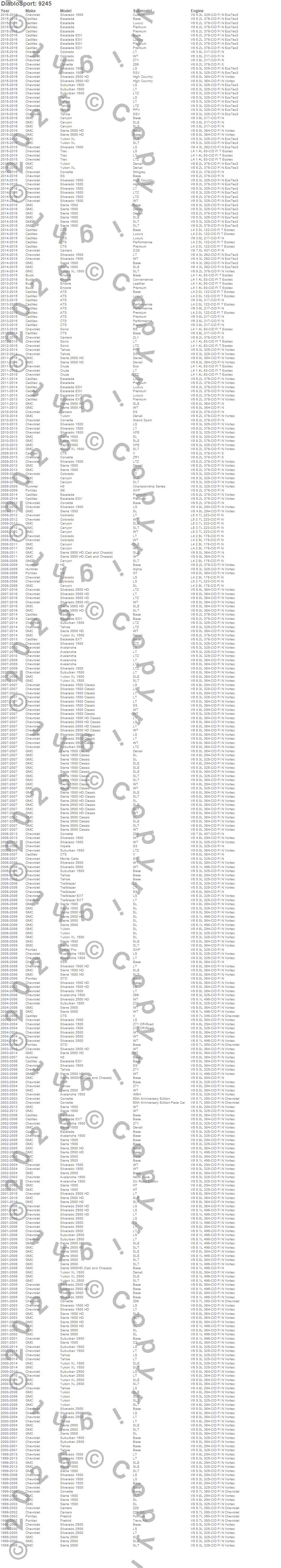 ATS, Avalanche, Avalanche 1500, Camaro, Canyon, Colorado, Corvette, Cruze, CTS, Encore, Escalade, Escalade ESV, Escalade EXT, Firebird, G8, Grand Prix, GTO, H2, H3, Impala