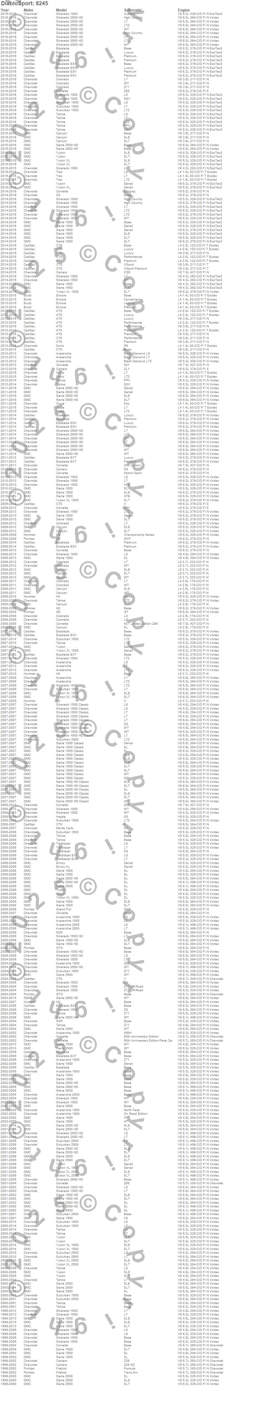 ATS, Avalanche, Avalanche 1500, Avalanche 2500, Camaro, Canyon, Colorado, Corvette, Cruze, CTS, Encore, Envoy, Envoy XL, Escalade, Escalade ESV, Escalade EXT, Firebird, G8, Grand Prix, GTO