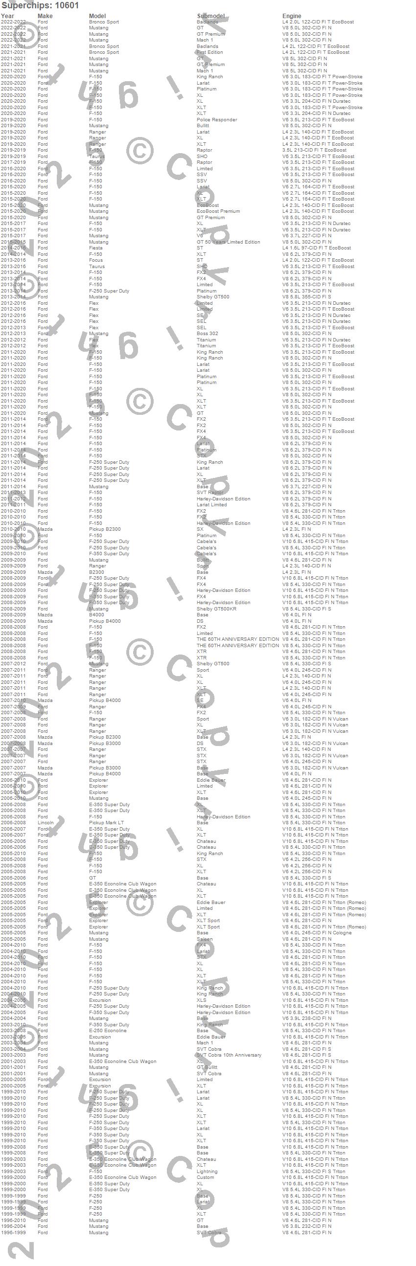 B2300, B3000, B4000, Bronco Sport, E-250 Econoline, E-350 Econoline Club Wagon, E-350 Super Duty, Excursion, Explorer, F-150, F-250, F-250 Super Duty, F-350 Super Duty, Fiesta, Flex, Focus, GT, Mark LT, Mustang, Ranger