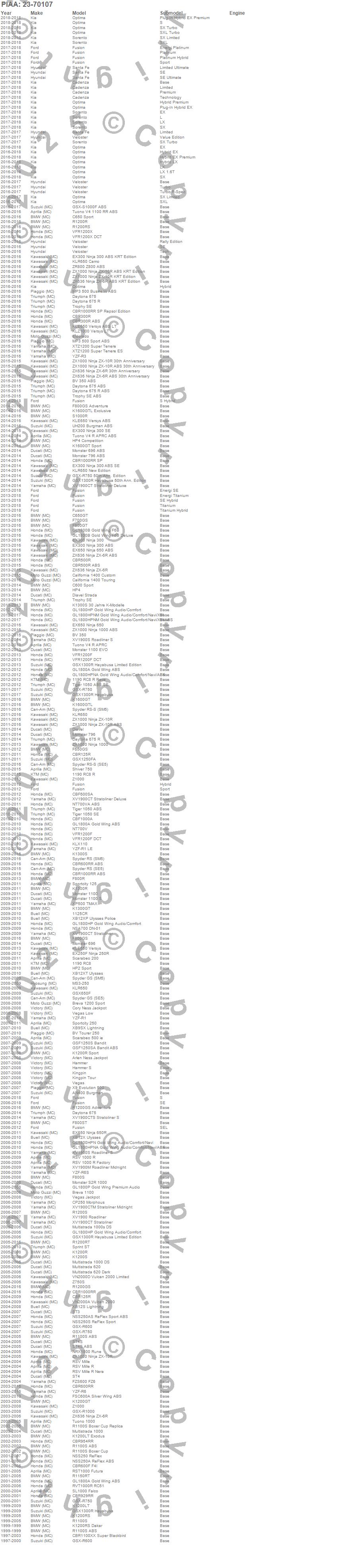 1125CR, 1190 RC8, 1190 RC8 R, 1190 RC8 R Race, AN400 Burgman, Arlen Ness Jackpot, Breva 1100, Breva 1200 Sport, BV 350, BV 350 ABS, BV Tourer 250, C600 Sport, C650 Sport, C650GT, Cadenza, California 1400 Custom, California 1400 Touring, CBF1000A, CBF600SA, CBR1000RR