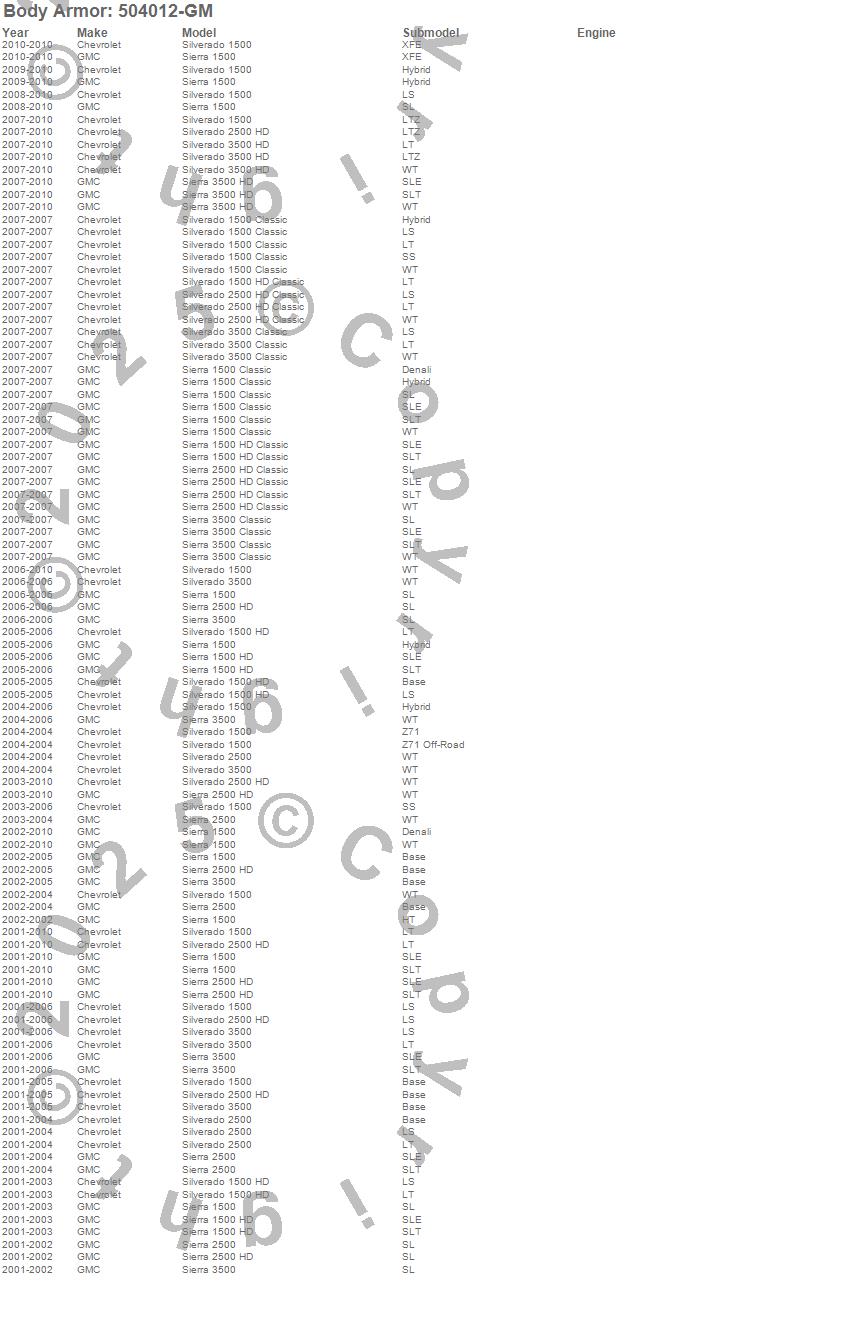Sierra 1500, Sierra 1500 Classic, Sierra 1500 HD, Sierra 1500 HD Classic, Sierra 2500, Sierra 2500 HD, Sierra 2500 HD Classic, Sierra 3500, Sierra 3500 Classic, Sierra 3500 HD, Silverado 1500, Silverado 1500 Classic, Silverado 1500 HD, Silverado 1500 HD Classic, Silverado 2500, Silverado 2500 HD, Silverado 2500 HD Classic, Silverado 3500, Silverado 3500 Classic, Silverado 3500 HD