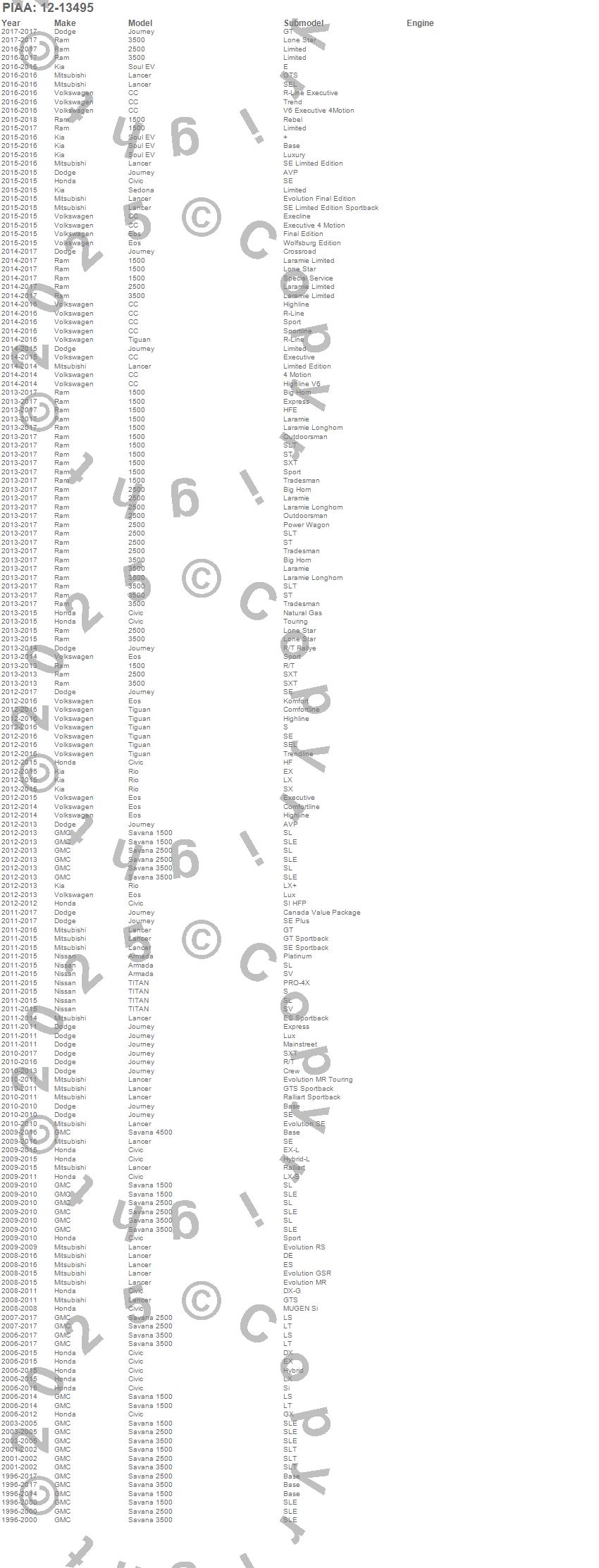 1500, 2500, 3500, Armada, CC, Civic, Eos, Journey, Lancer, Rio, Savana 1500, Savana 2500, Savana 3500, Savana 4500, Sedona, Soul EV, Tiguan, TITAN, Dodge, GMC