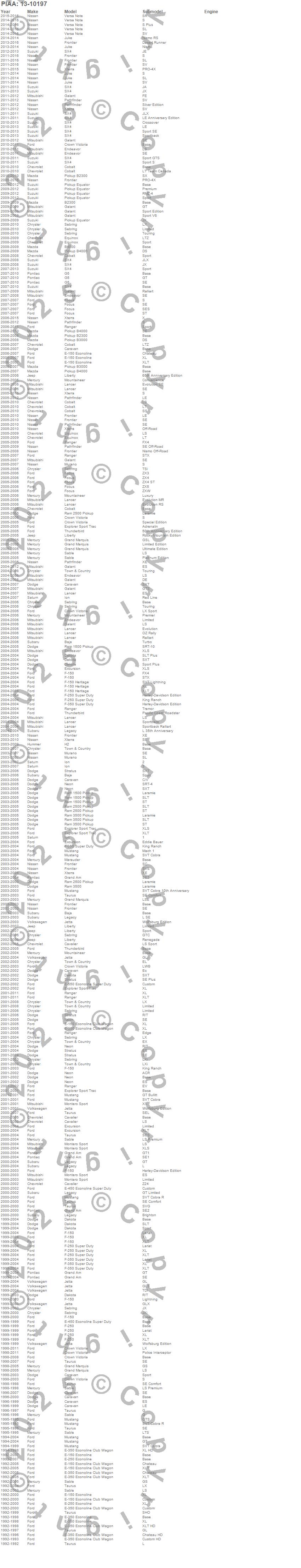 B2300, B3000, B4000, Baja, Caravan, Cavalier, Cobalt, Crown Victoria, Dakota, E-150 Econoline, E-150 Econoline Club Wagon, E-250 Econoline, E-350 Econoline, E-350 Econoline Club Wagon, E-450 Econoline Super Duty, E-550 Econoline Super Duty, Endeavor, Equator, Equinox, Excursion
