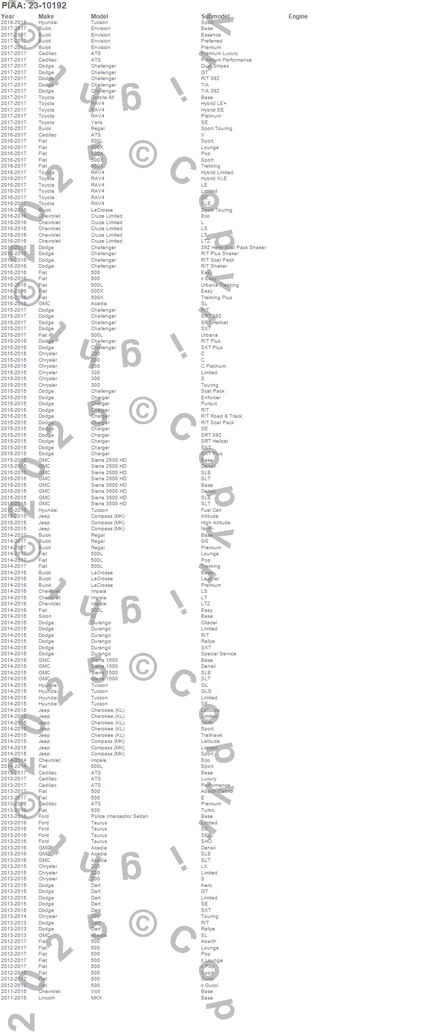 200, 300, 500, 500L, 500X, Acadia, ATS, Challenger, Charger, Cherokee (KL), Compass, Corolla iM, Cruze Limited, Dart, Durango, Envision, Impala, LaCrosse, MKX, Police Interceptor Sedan
