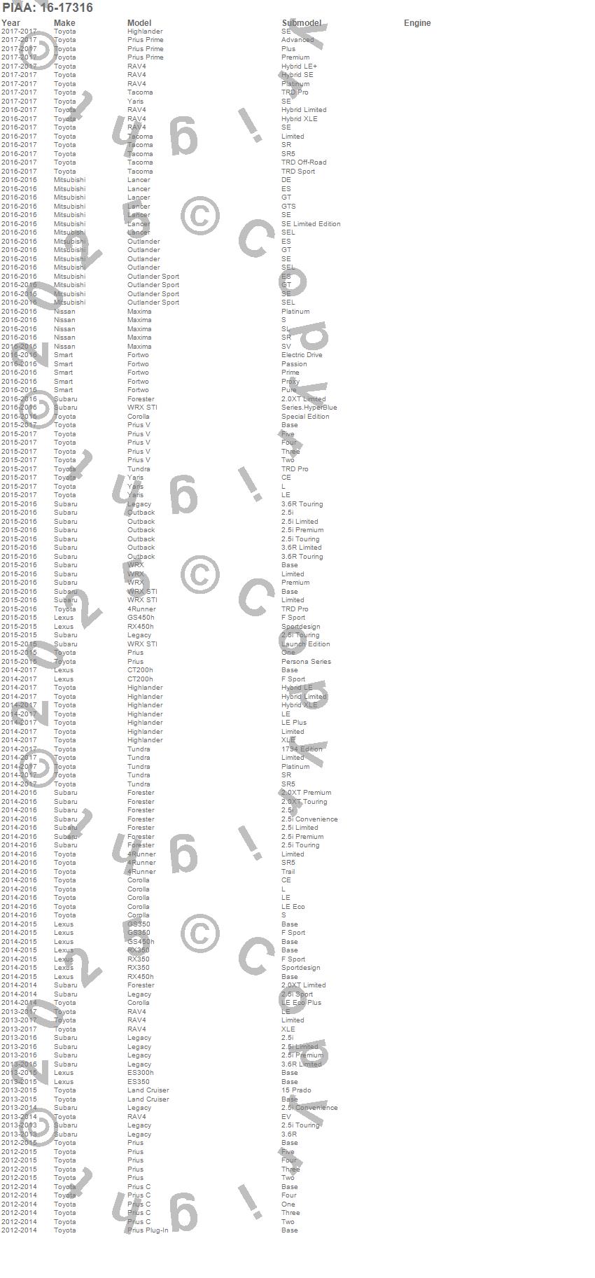 4Runner, Corolla, CT200h, ES300h, ES350, Forester, Fortwo, GS350, GS450h, Highlander, Lancer, Land Cruiser, Legacy, Maxima, Outback, Outlander, Outlander Sport, Prius, Prius C, Prius Plug-In