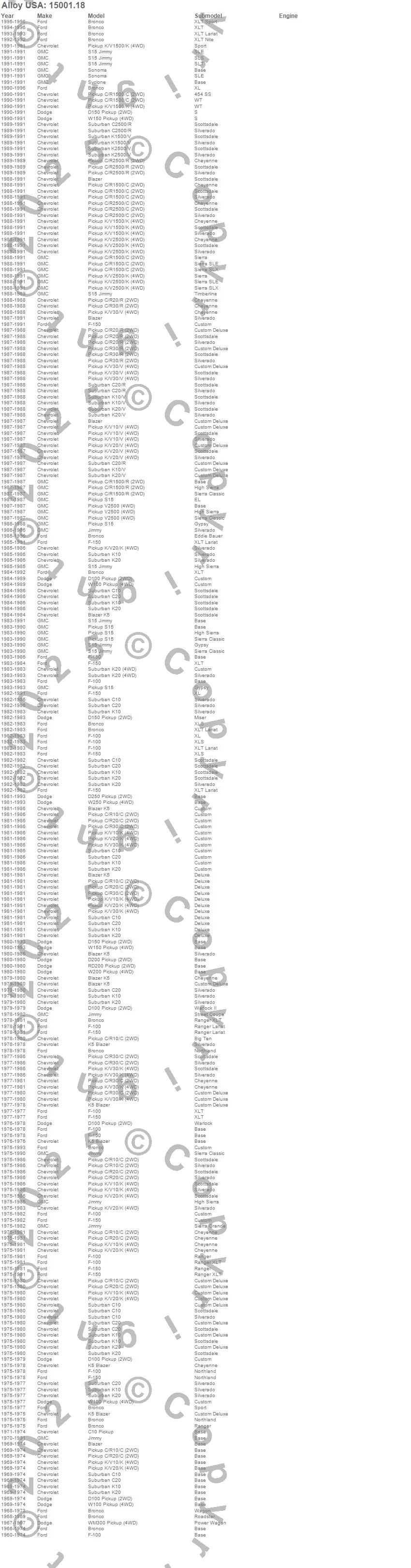 Blazer, Blazer K5, Bronco, C10 Pickup, C10 Suburban, C1500 Pickup, C20 Pickup, C20 Suburban, C2500 Pickup, C30 Pickup, D100 Pickup, D150 Pickup, D200 Pickup, D250 Pickup, F-100, F-150, Jimmy, K10 Pickup, K10 Suburban, K1500 Pickup
