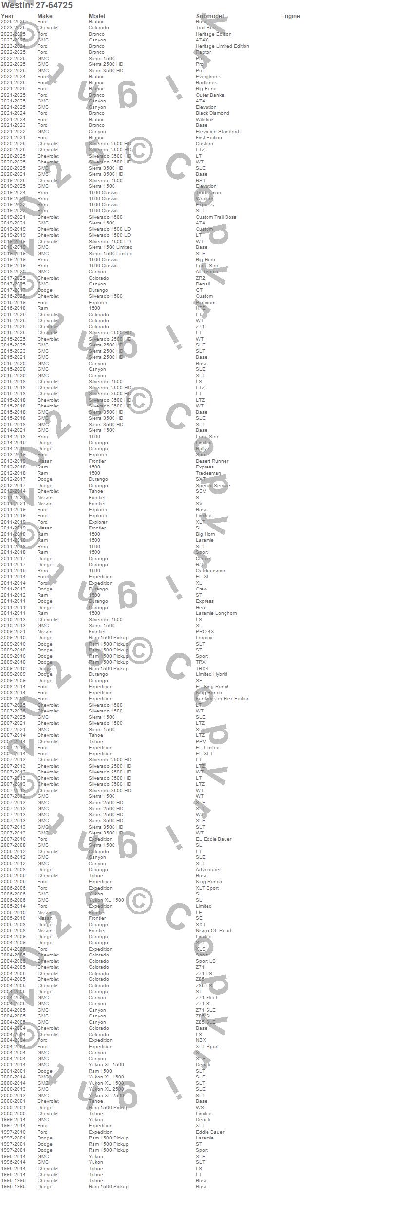 1500, 1500 Classic, Bronco, Canyon, Colorado, Durango, Expedition, Explorer, Frontier, Ram 1500, Sierra 1500, Sierra 1500 Limited, Sierra 2500 HD, Sierra 3500 HD, Silverado 1500, Silverado 1500 LD, Silverado 2500 HD, Silverado 3500 HD, Tahoe, Yukon