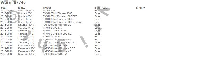 Alterra 400, KAF400 Mule 610 4x4, KAF400 Mule 610 4x4 SE, KAF400 Mule 610 4x4 XC, KAF400 Mule 610 4x4 XC SE, KAF820 Mule PRO-FXT, SXS1000M3 Pioneer 1000, SXS1000M3 Pioneer 1000 EPS, SXS1000M5 Pioneer 1000-5, SXS1000M5 Pioneer 1000-5 Deluxe, YFM700K Kodiak, YFM700K Kodiak EPS, YFM700K Kodiak EPS SE, YXE70 Wolverine, YXE70 Wolverine R-Spec, YXE70 Wolverine R-Spec EPS, Arctic Cat (ATV), Honda (UTV), Kawasaki (UTV), Yamaha (ATV)