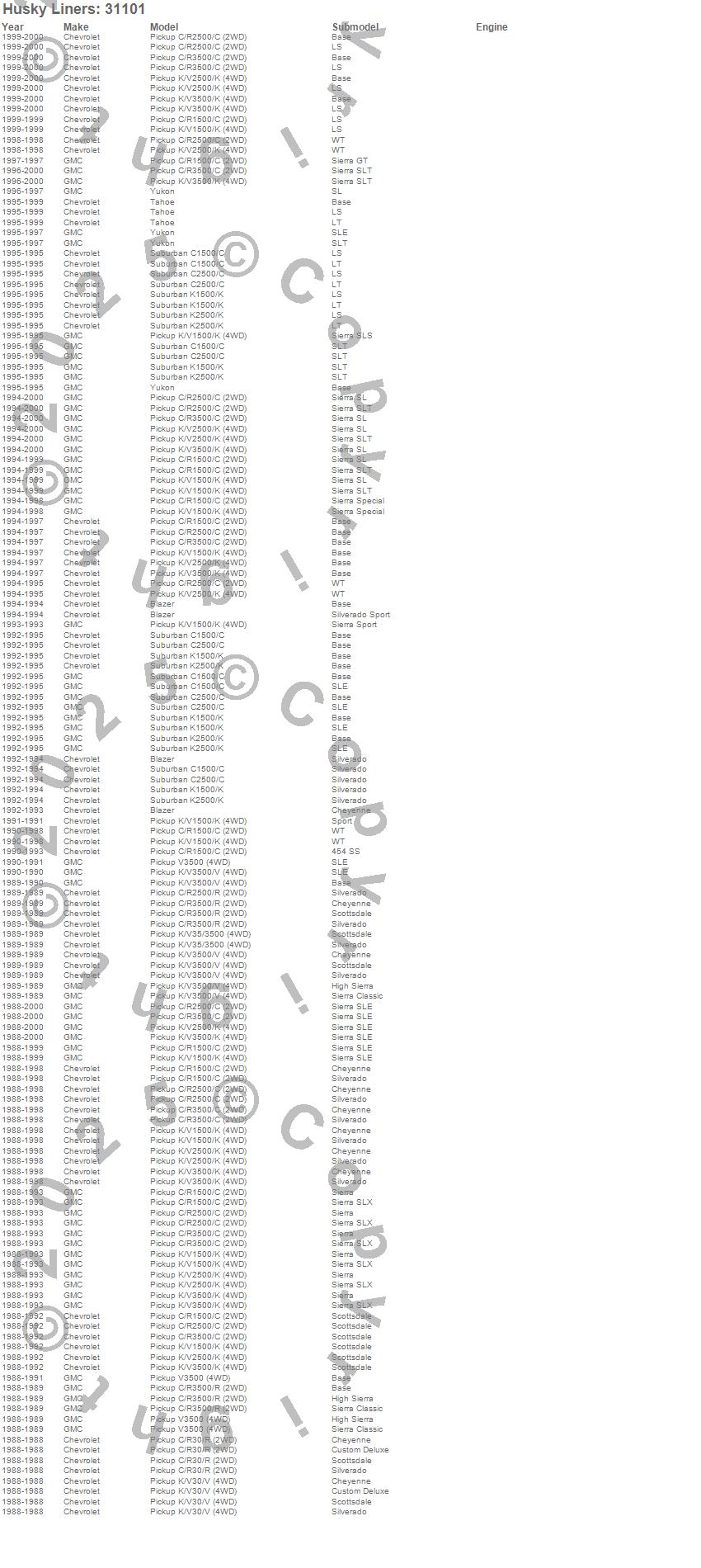 Blazer, C1500 Pickup, C1500 Suburban, C2500 Pickup, C2500 Suburban, C3500 Pickup, K1500, K1500 Pickup, K1500 Suburban, K2500 Pickup, K2500 Suburban, K3500 Pickup, R2500 Pickup, R30 Pickup, R3500 Pickup, Tahoe, V30 Pickup, V3500 Pickup, Yukon, Chevrolet