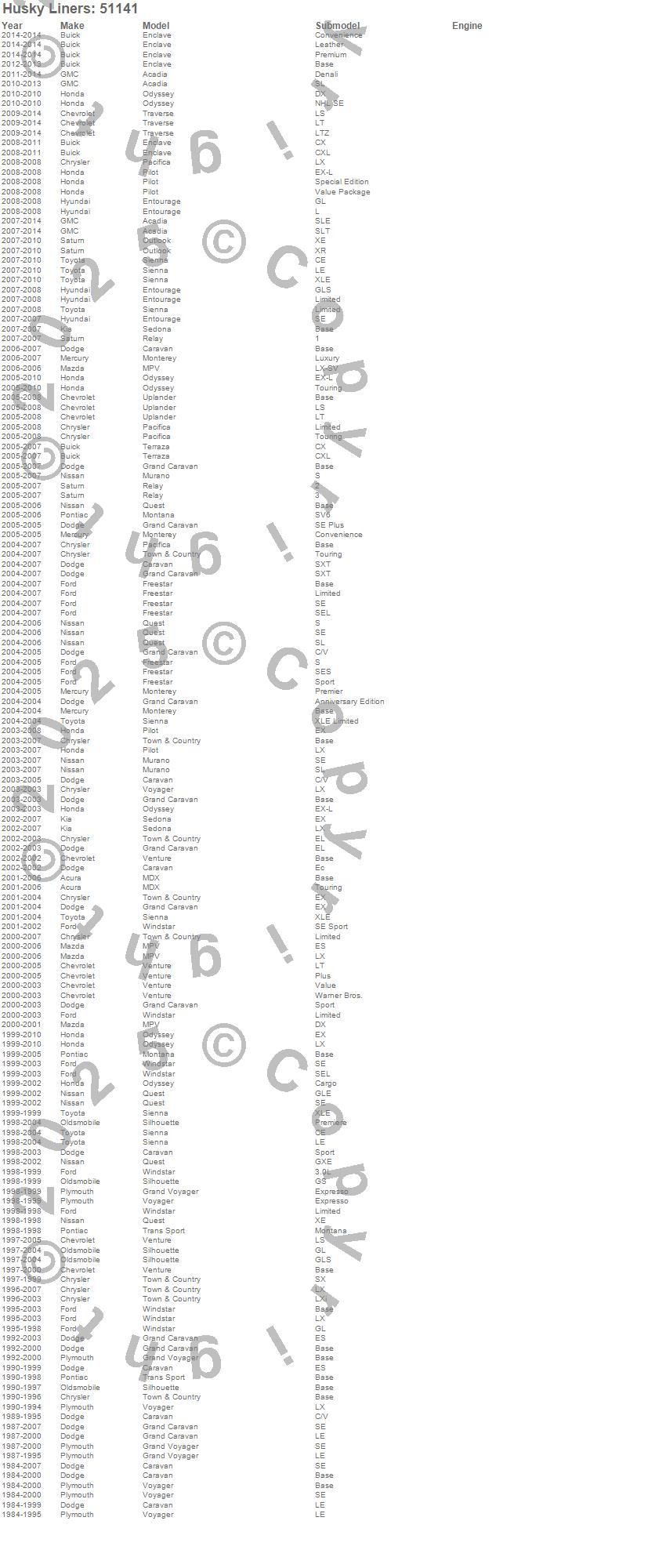 Acadia, Caravan, Enclave, Entourage, Freestar, Grand Caravan, Grand Voyager, MDX, Montana, Monterey, MPV, Murano, Odyssey, Outlook, Pacifica, Pilot, Quest, Relay, Sedona, Sienna