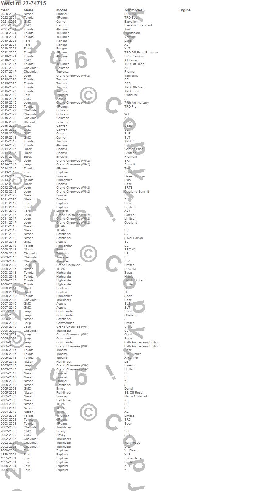 4Runner, Acadia, Canyon, Colorado, Commander, Enclave, Envoy, Explorer, Frontier, Grand Cherokee, Grand Cherokee (WK), Grand Cherokee (WK2), Highlander, Land Cruiser, Pathfinder, Ranger, Tacoma, TITAN, Trailblazer, Traverse