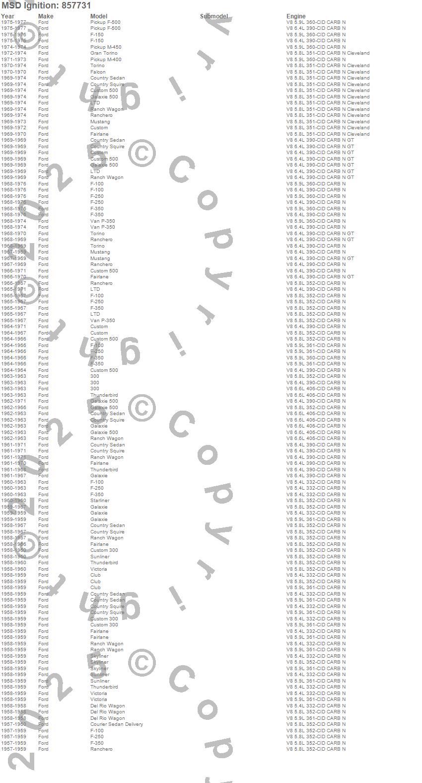 300, Club, Country Sedan, Country Squire, Courier Sedan Delivery, Custom, Custom 300, Custom 500, Del Rio Wagon, F-100, F-150, F-250, F-350, F-500 Pickup, Fairlane, Falcon, Galaxie, Galaxie 500, Gran Torino, LTD