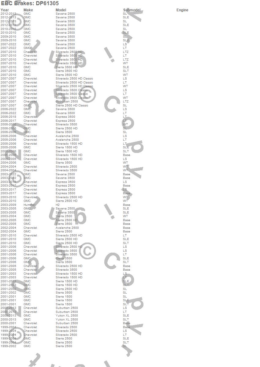 Avalanche 2500, Express 2500, Express 3500, H2, Savana 2500, Savana 3500, Sierra 1500, Sierra 1500 HD, Sierra 2500, Sierra 2500 HD, Sierra 2500 HD Classic, Sierra 3500, Sierra 3500 HD, Silverado 1500 HD, Silverado 2500, Silverado 2500 HD, Silverado 2500 HD Classic, Silverado 3500, Silverado 3500 Classic, Silverado 3500 HD