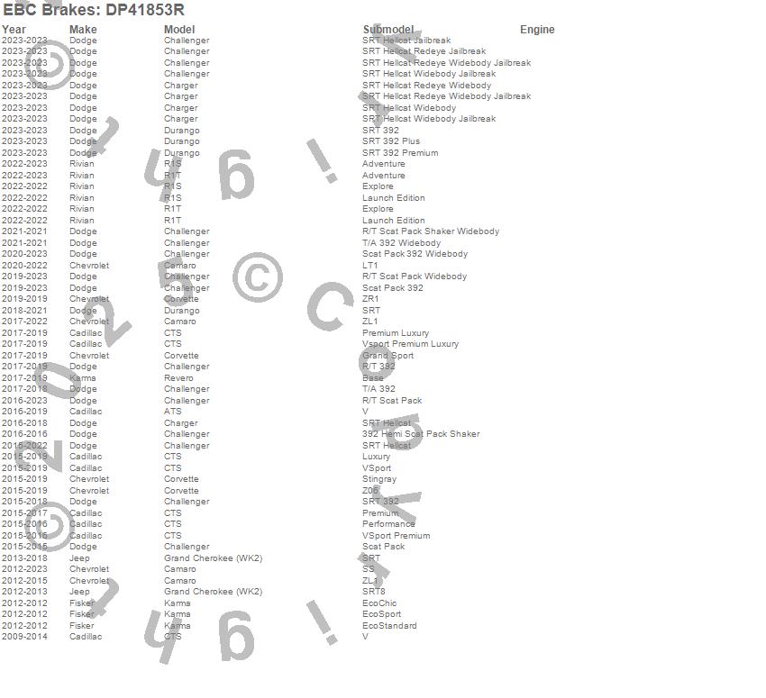 ATS, Camaro, Challenger, Charger, Corvette, CTS, Durango, Grand Cherokee (WK2), Karma, R1S, R1T, Revero, Cadillac, Chevrolet, Dodge, Fisker, Jeep, Karma, Rivian, 2023