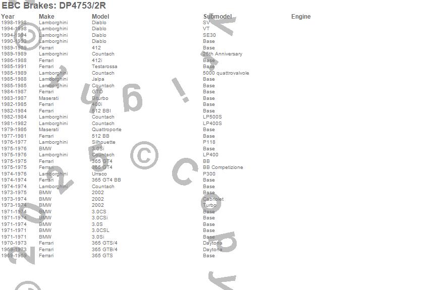 2002, 3.0CS, 3.0CSi, 3.0CSL, 3.0S, 3.0Si, 365 GT4, 365 GT4 BB, 365 GTB/4, 365 GTS, 365 GTS/4, 400i, 412, 412i, 512 BB, 512 BBI, Biturbo, Countach, Diablo, GTO