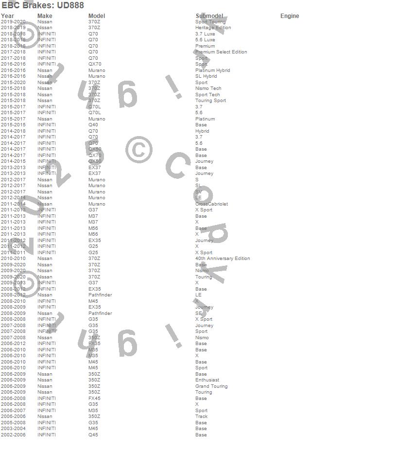 350Z, 370Z, EX35, EX37, FX35, FX45, G25, G35, G37, M35, M37, M45, M56, Murano, Pathfinder, Q40, Q45, Q70, Q70L, QX50