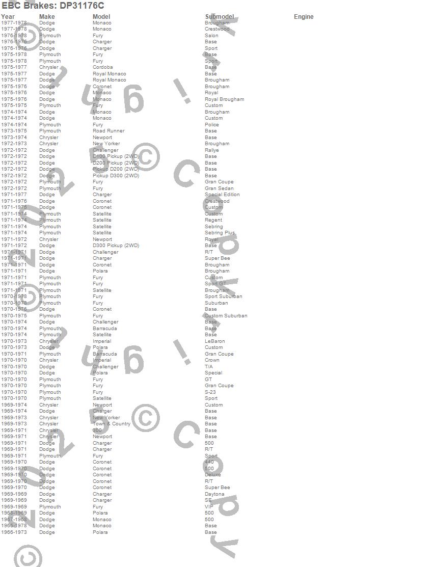 300, Barracuda, Challenger, Charger, Cordoba, Coronet, D100 Pickup, D200 Pickup, D300 Pickup, Fury, Imperial, Monaco, New Yorker, Newport, Polara, Road Runner, Royal Monaco, Satellite, Town & Country, Chrysler