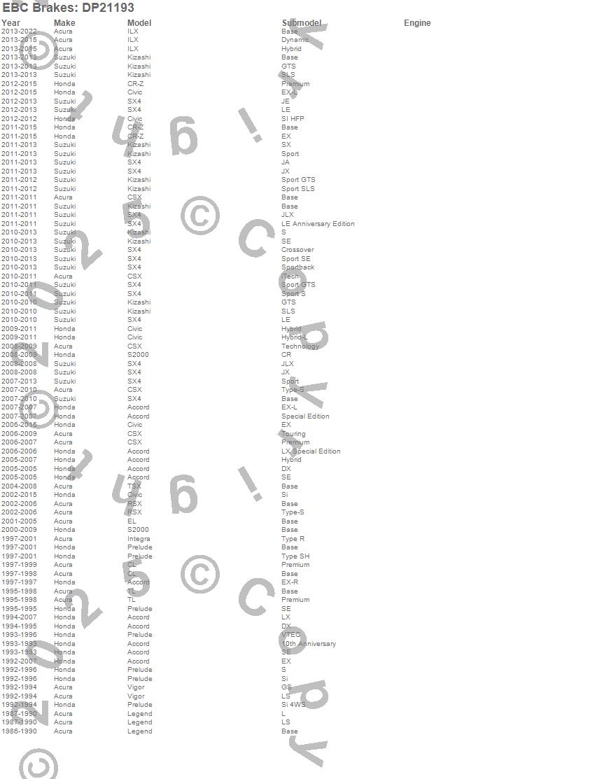 Accord, Civic, CL, CR-Z, CSX, EL, ILX, Integra, Kizashi, Legend, Prelude, RSX, S2000, SX4, TL, TSX, Vigor, Acura, Honda, Suzuki