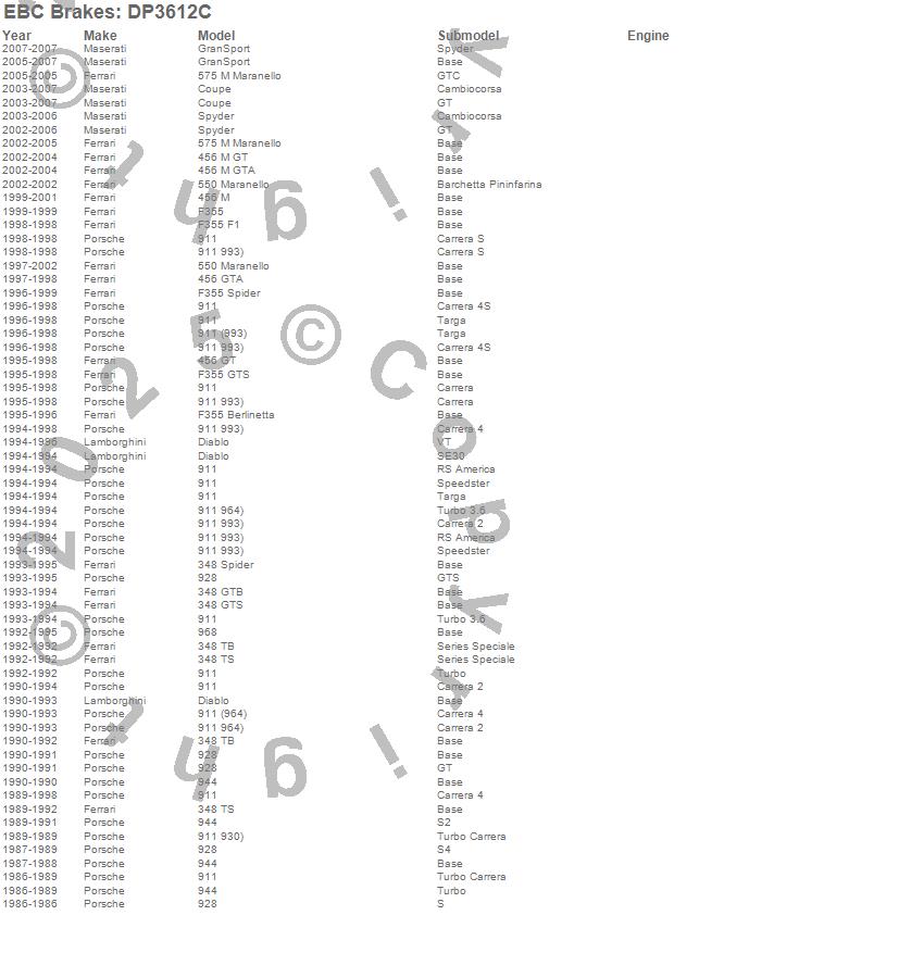 348 GTB, 348 GTS, 348 Spider, 348 TB, 348 TS, 456 GT, 456 GTA, 456 M, 456 M GT, 456 M GTA, 550 Maranello, 575 M Maranello, 911, 928, 944, 968, Coupe, Diablo, F355, F355 Berlinetta