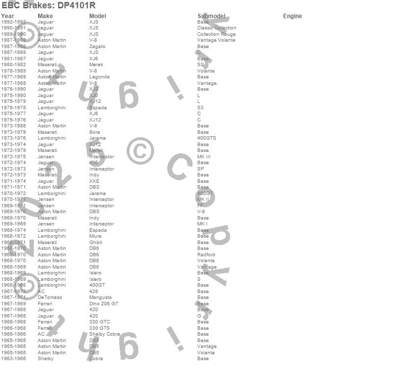 330 GTC, 330 GTS, 400GT, 420, 428, Bora, Cobra, DB5, DB6, DBS, Dino 206 GT, Espada, Ghibli, Indy, Interceptor, Islero, Jarama, Lagonda, Mangusta, Merak