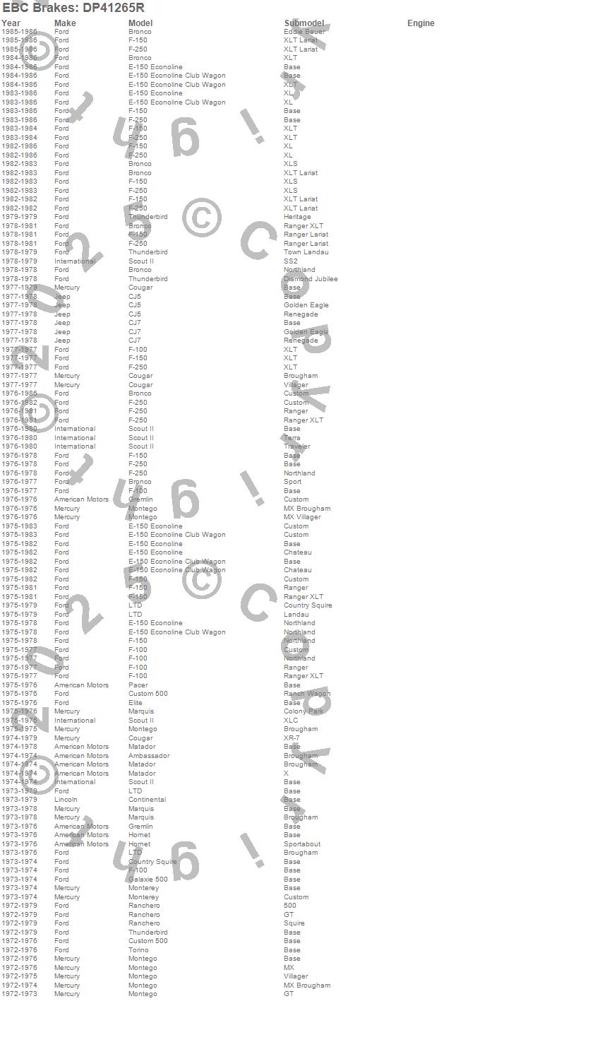 Ambassador, Bronco, CJ5, CJ7, Continental, Cougar, Country Squire, Custom 500, E-150 Econoline, E-150 Econoline Club Wagon, Elite, F-100, F-150, F-250, Galaxie 500, Gremlin, Hornet, LTD, Marquis, Matador