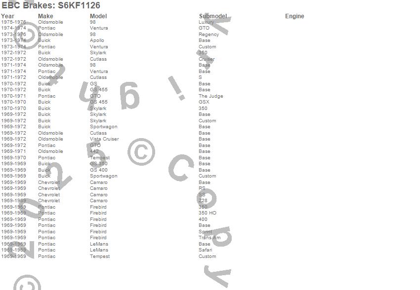 442, 98, Apollo, Camaro, Cutlass, Firebird, GS, GS 350, GS 400, GS 455, GTO, LeMans, Skylark, Sportwagon, Tempest, Ventura, Vista Cruiser, Buick, Chevrolet, Oldsmobile