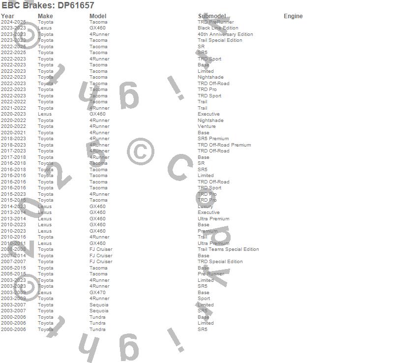 Below is an abbreviated list of applications for the 6000 Series Greenstuff Truck/SUV Brakes Disc Pads.