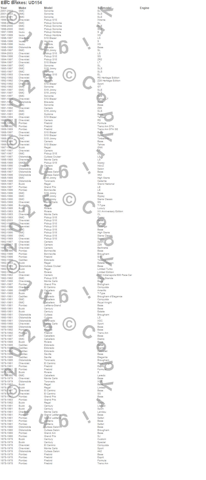 Bonneville, Bravada, Caballero, Camaro, Century, Cutlass, Cutlass Cruiser, Cutlass Salon, El Camino, Eldorado, Firebird, Grand Am, Grand LeMans, Grand Prix, Hombre, LeMans, Monte Carlo, Regal, Riviera, S10 Blazer