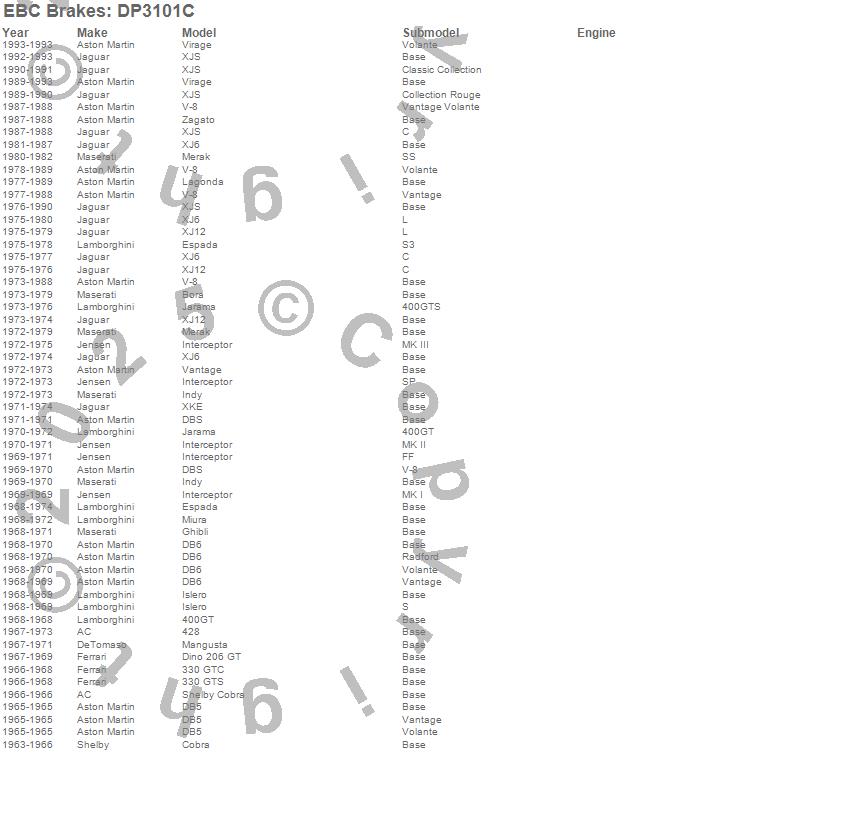 330 GTC, 330 GTS, 400GT, 428, Bora, Cobra, DB5, DB6, DBS, Dino 206 GT, Espada, Ghibli, Indy, Interceptor, Islero, Jarama, Lagonda, Mangusta, Merak, Miura