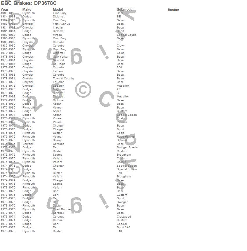 Aspen, Charger, Cordoba, Coronet, Dart, Diplomat, Duster, Fifth Avenue, Gran Fury, Imperial, LeBaron, Magnum, Mirada, New Yorker, Newport, Road Runner, Scamp, St. Regis, Town & Country, Valiant