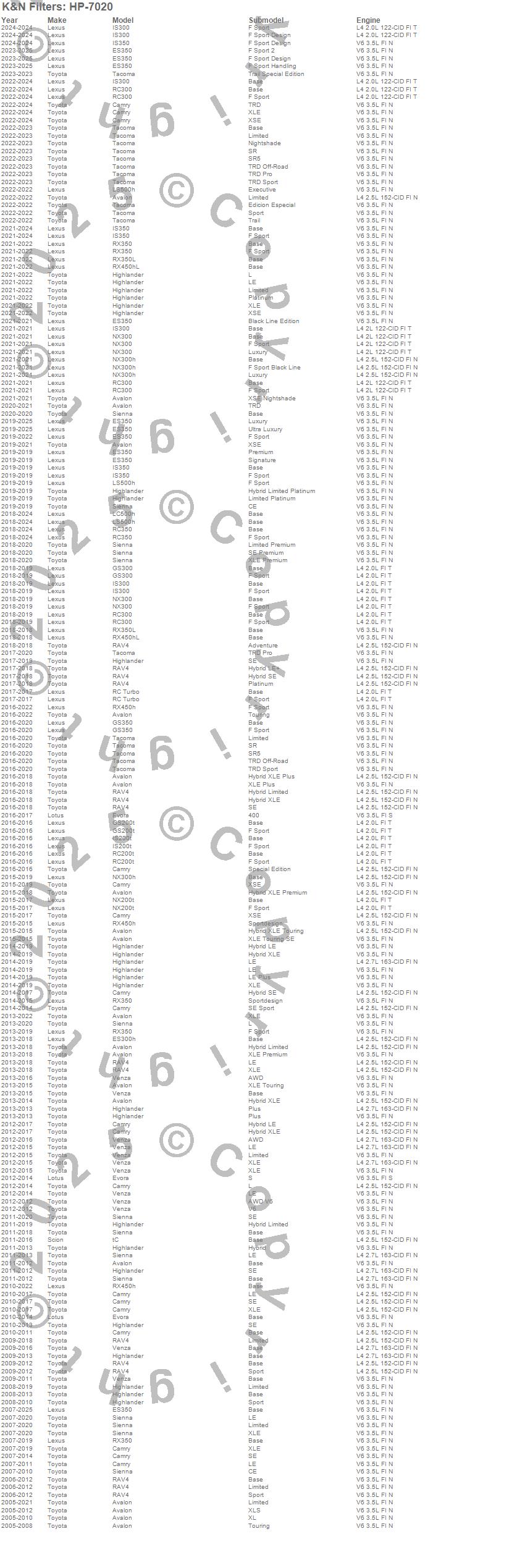 Avalon, Camry, ES300h, ES350, Evora, GS200t, GS300, GS350, Highlander, IS200t, IS300, IS350, LC500h, LS500h, NX200t, NX300, NX300h, RAV4, RC Turbo, RC200t
