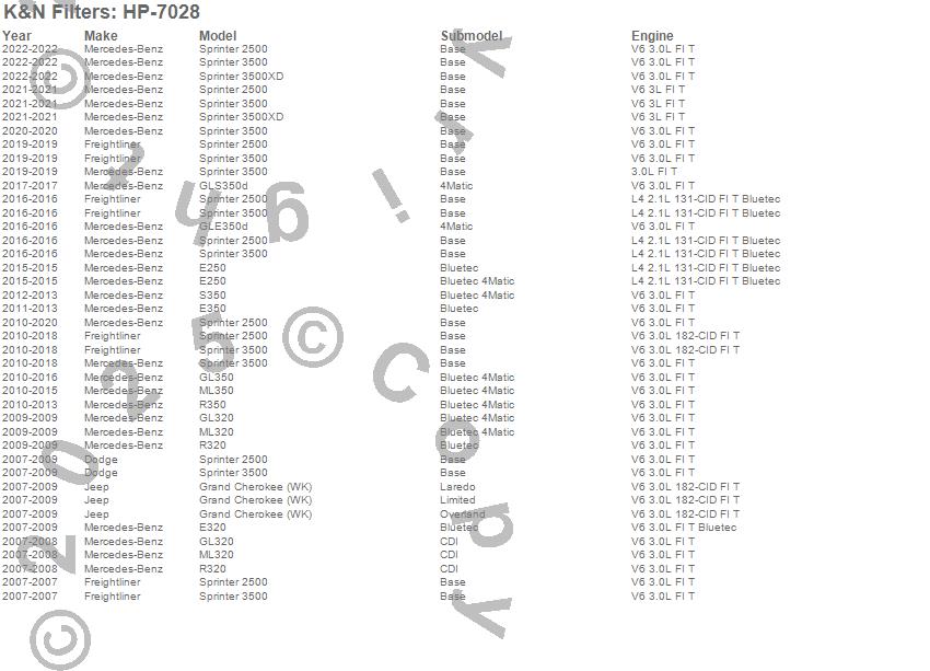 E250, E320, E350, GL320, GL350, GLE350d, GLS350d, Grand Cherokee (WK), ML320, ML350, R320, R350, S350, Sprinter 2500, Sprinter 3500, Sprinter 3500XD, Dodge, Freightliner, Jeep, Mercedes-Benz